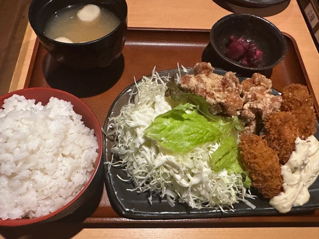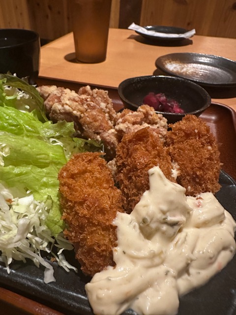 11/26【京都市伏見区居酒屋ランチ】大手筋商店街の焼き鳥ぎんじ 2025/11/26 お店紹介, ごはんの話, 伏見桃山の話 どーも。お酒飲まないミナージュです。 大手筋商店街の焼き鳥ぎんじ ランチやってたんで食べてきた。 ユウリンチあったけど無難なやついっとかなあかんと思って カキフライ唐揚げにしました。 1408円 味噌汁、漬物、野菜山盛り、ご飯山盛り、とメインでした。 店はお昼時でも飲んでる人いるから めちゃくちゃうるさいけど当たり前! 居酒屋だもの! でもさすが居酒屋。 ランチも美味しいですね。 焼き鳥ぎんじ伏見桃山店 大手筋商店街の中ですよー。