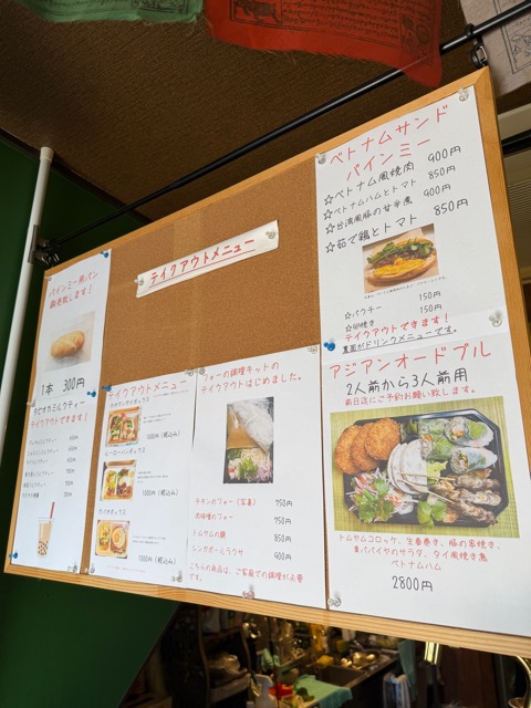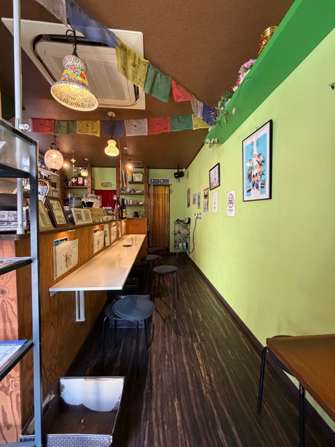 お店の入り口は、レトロなフォントの看板と、ベトナムのサンドイッチ「バインミー」ののぼりが目印。 一歩中に入ると、鮮やかなグリーンの壁とチベットの祈祷旗(タルチョ)が飾られた、異国情緒あふれる空間が広がっています。