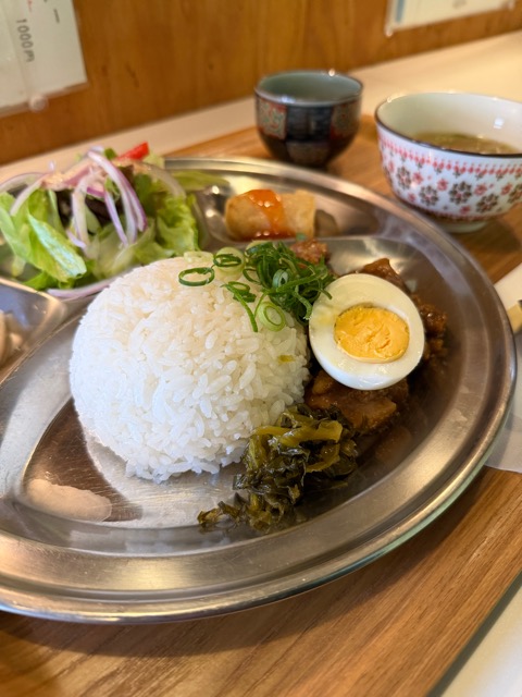 メインのプレート:ふっくら炊かれたライスに、じっくり煮込まれたお肉、半熟のゆで卵。付け合わせの香物やシャキシャキのサラダがバランス良く、一口ごとに異なる味わいが楽しめます。