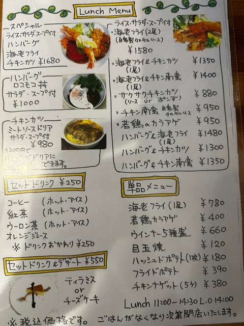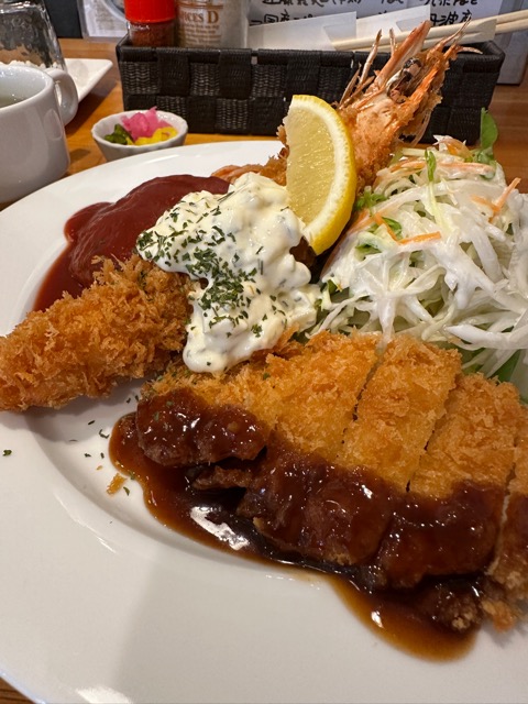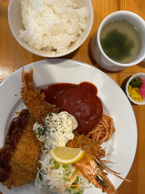 1,680円のチキンカツと大海老フライ&ハンバーグ+サラダ、スープ、漬物、ご飯(大中小選択制)。
