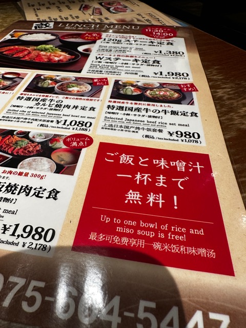 10/12 【京都市伏見区焼肉ランチ】 蔵 2025/10/12 お店紹介, ごはんの話, 日記 どーも。夜はまだのミナージュです。 大手筋商店街 焼肉屋さん蔵がランチしています。 昼からこの雰囲気は贅沢ですね〜 ご飯と味噌汁は一杯まで無料! さすがランチ! でも僕はどんぶりだから! ジョッキウーロン茶が嬉しい^ ^ 次は夜だ! 蔵さんごちそうさまでした〜 大手筋商店街内ですよ。 すぐわかります〜