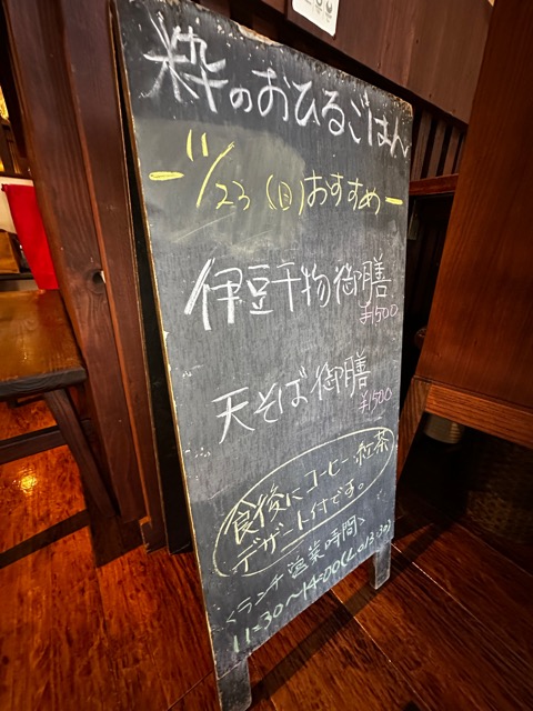 12/22【京都市伏見区居酒屋】 居酒屋ランチ 粋 2025/12/22 お店紹介, ごはんの話, 伏見桃山の話, 日記 どーも。勝手に紹介するミナージュです。 居酒屋粋。 ランチしているの知らなんだです。 大手筋商店街をちょっと南へ 居酒屋粋。 なんでも干物の定食が人気ですぐに無くなるらしい。 案の定売切れでお蕎麦の定食にした私。 天ぷら蕎麦御前1500円 コーヒーデザート付きです 夜しか来たことなかったけどみんなよく知ってるね~ 混雑していました。 夜また行きますね~